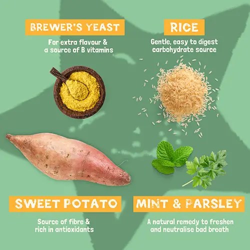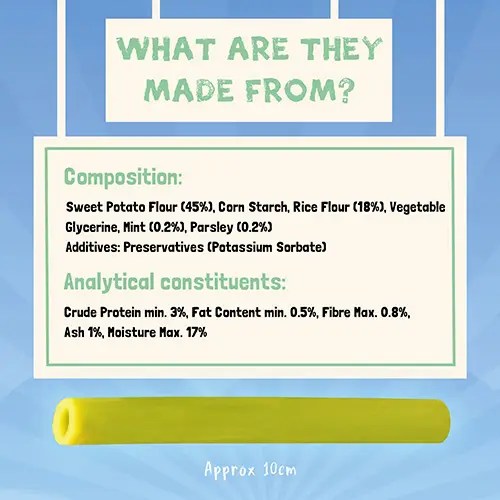 Sweet Potato Flour (45%), Corn Starch, Rice Flour (18%), Vegetable Glycerin, Mint (0.2%), Parsley (0.2%), Potassium Sorbate.