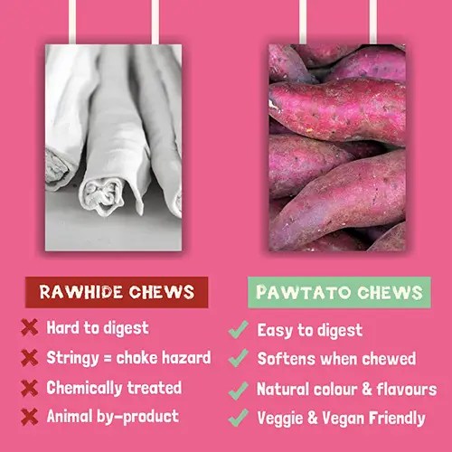 - Natural Sweet Potato Dog Chews | Pawtato’s plant-based dog treats are based on nutritious sweet potato, a true superfood, blended with rice and fused with mint and parsley to produce this pack of vegan dog chews.