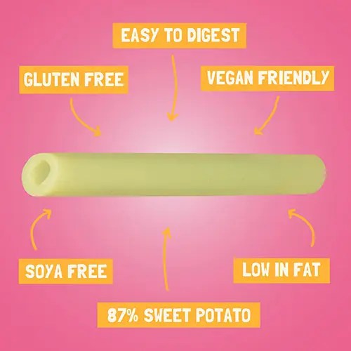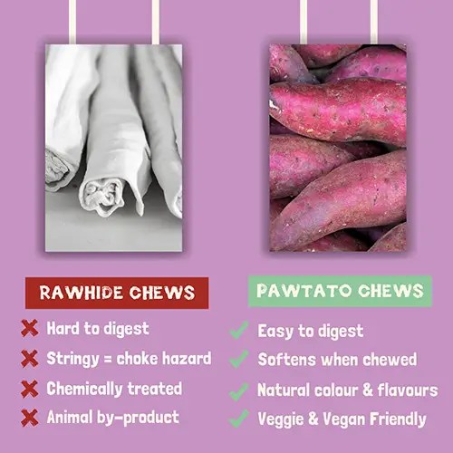 - Natural Sweet Potato Dog Chews | Pawtato’s plant-based dog treats are based on nutritious sweet potato, a true superfood, blended with rice and fused with seaweed to produce this pack of vegan dog chews.