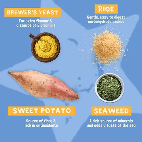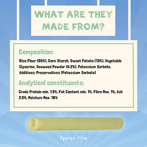 Rice Flour (45%), Corn Starch, Sweet Potato Flour (13%), Vegetable Glycerin, Seaweed (0.2%), Potassium Sorbate.